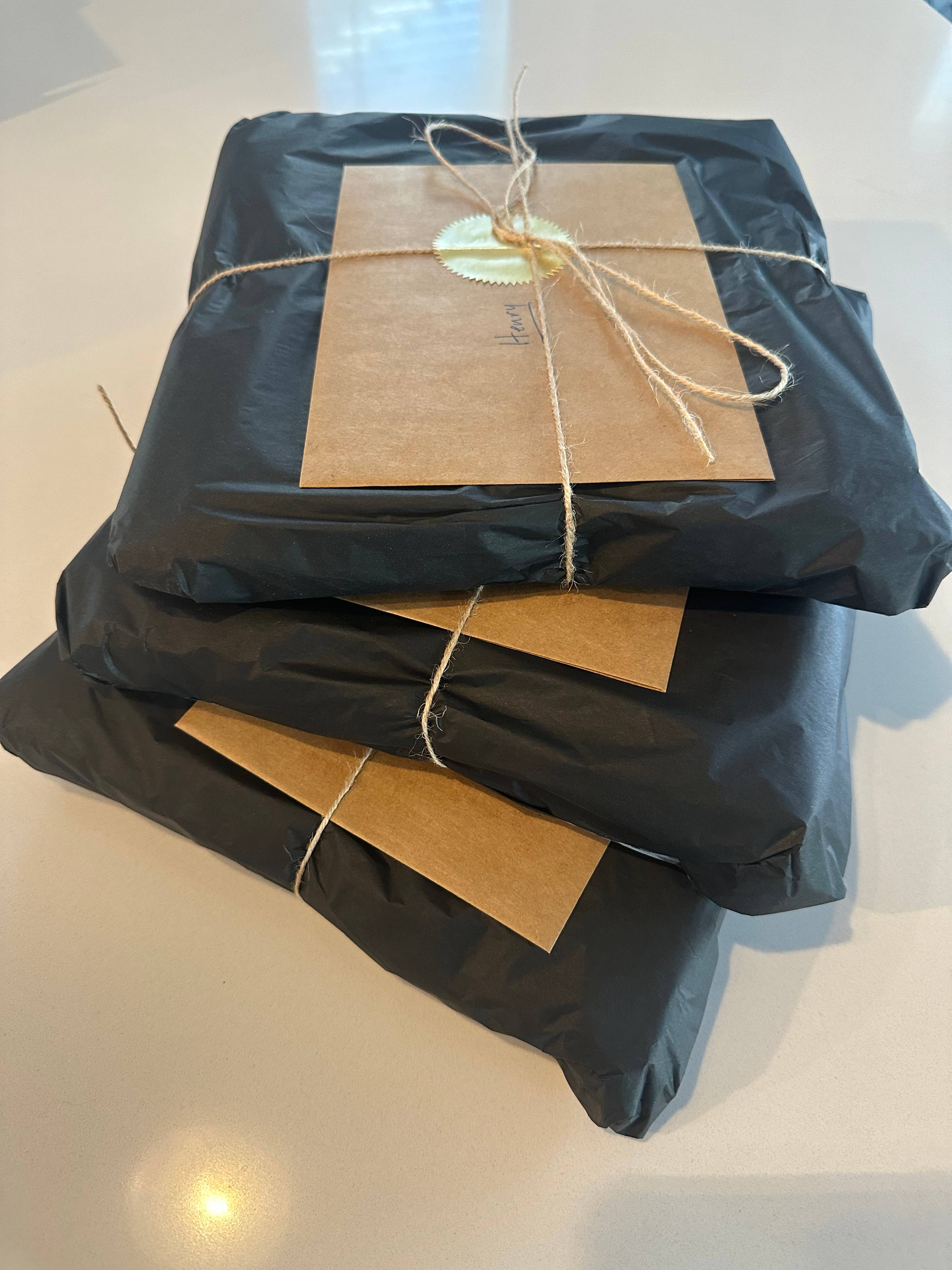 The gift comes with a handwritten note on a handmade card stamped with a custom stamp I had made.